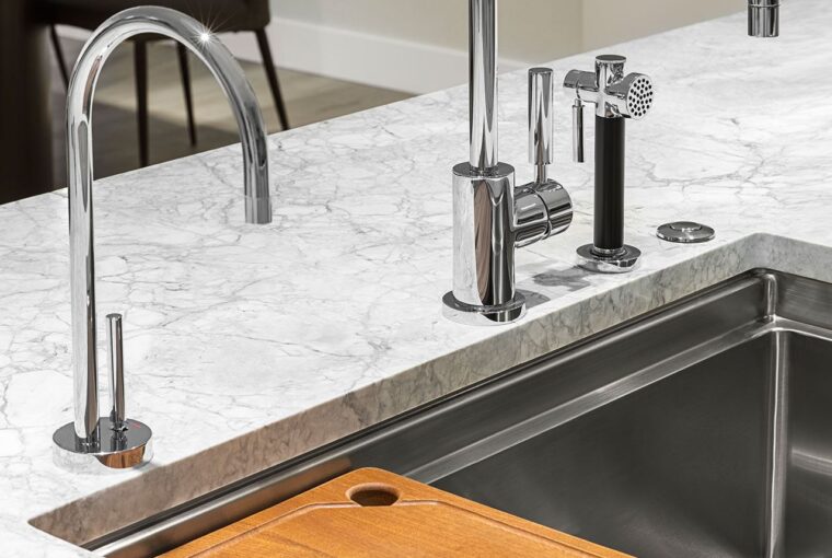 polished marble stone slab countertops with 4” mitered stone apron and undermount wash basin with motion controlled under cabinet LED pathway lighting elevate the year-round spa experience