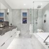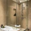 • Generous walk-in showers encased in frameless glass and floor-to-ceiling polished marble or limestone tile with marble mosaic floors and tiled drain, and a shower niche for convenient storage
