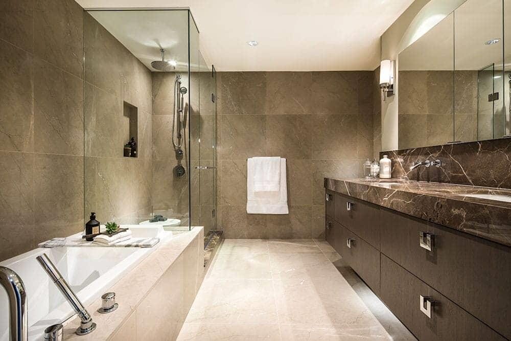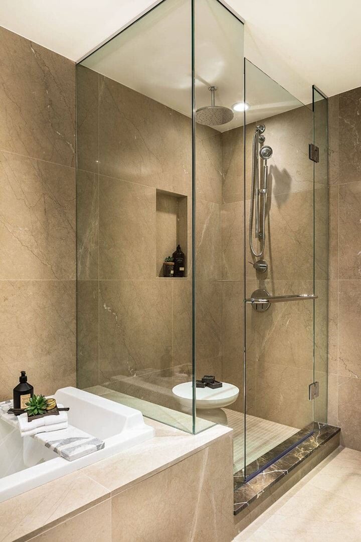 • Generous walk-in showers encased in frameless glass and floor-to-ceiling polished marble or limestone tile with marble mosaic floors and tiled drain, and a shower niche for convenient storage
