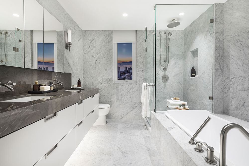 • 24”x 24” polished marble (False Creek) or honed limestone (English Bay) or polished marble (Beach District) tile floor and walls with coordinating 2”x 6” shower floor tile