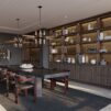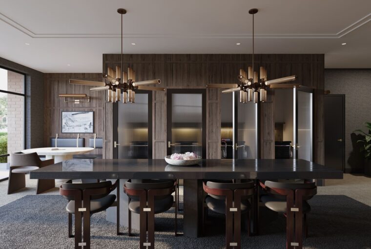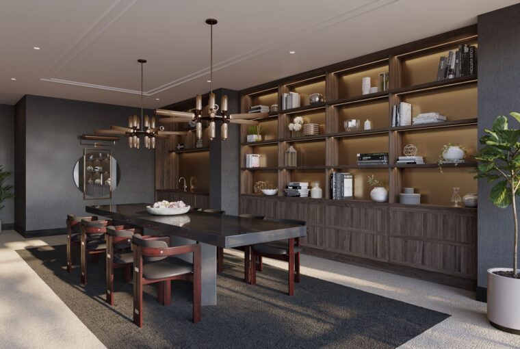 Autograph’s Signature Library amenity room features fully equipped individual work pods with task lighting and high-speed internet connection, as well as a communal harvest table for hosting meetings, book clubs or celebrations