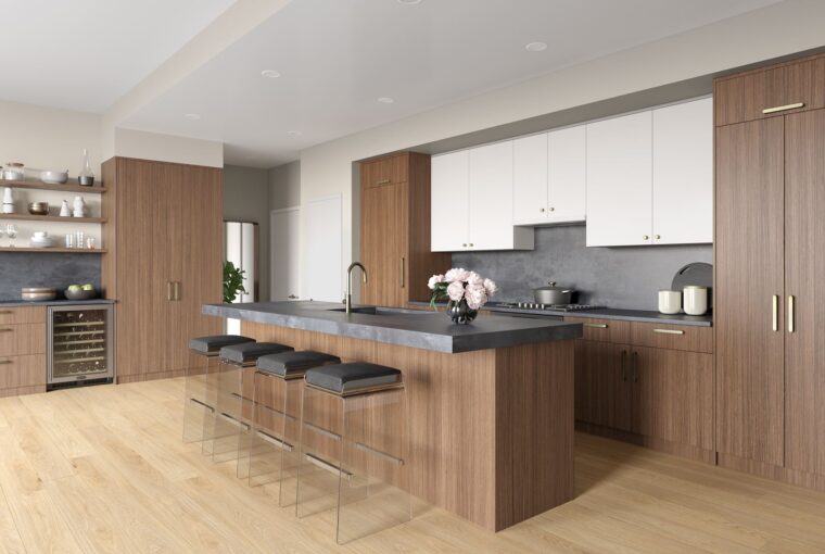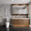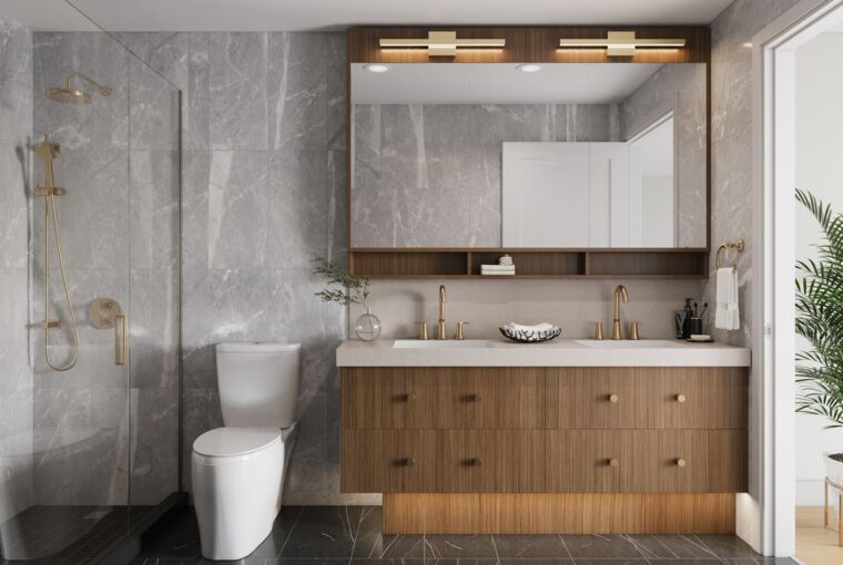 Ensuite bathrooms include stunning contemporary vanity design with champagne bronze hardware, open shelving and sleek, refined cabinetry in a crisp white oak or warm dark walnut