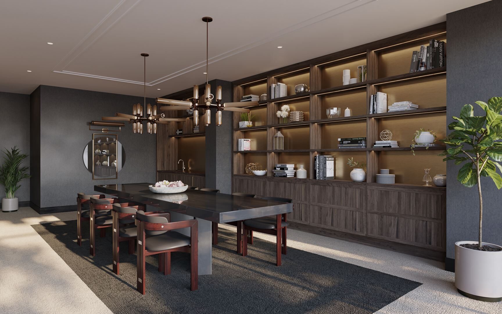 Autograph’s Signature Library amenity room features fully equipped individual work pods with task lighting and high-speed internet connection, as well as a communal harvest table for hosting meetings, book clubs or celebrations