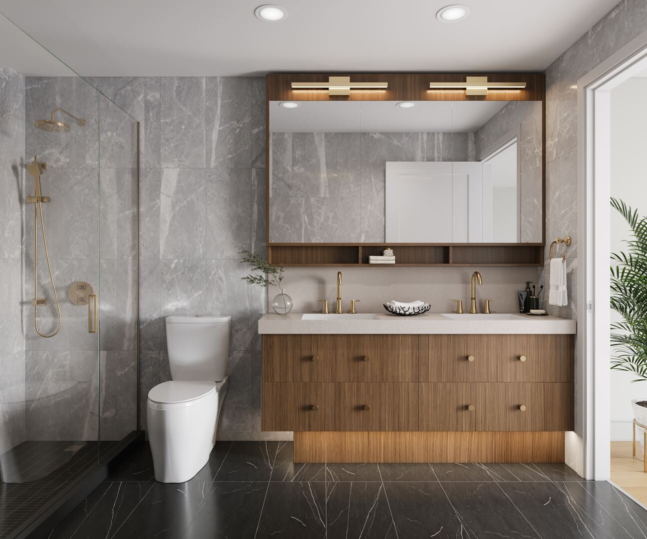 Ensuite bathrooms include stunning contemporary vanity design with champagne bronze hardware, open shelving and sleek, refined cabinetry in a crisp white oak or warm dark walnut