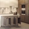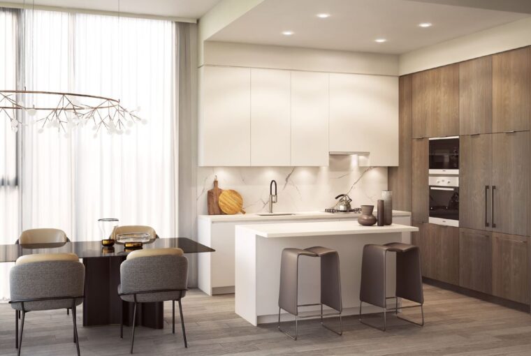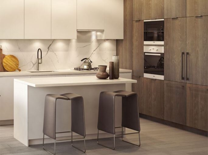 • Sleek, high-gloss finish on upper lower cabinetry and wood veneer on pantry wall