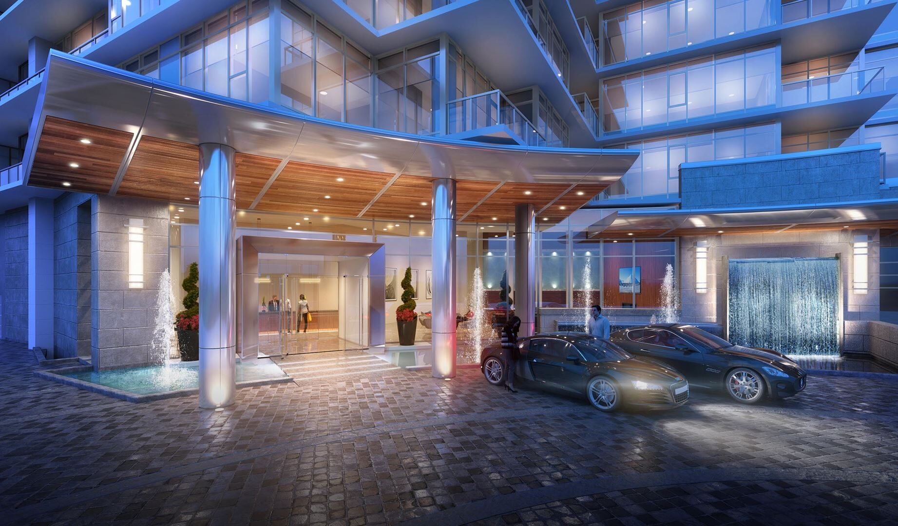• Statement canopy entrance with porte-cochere flanked by extensive water features