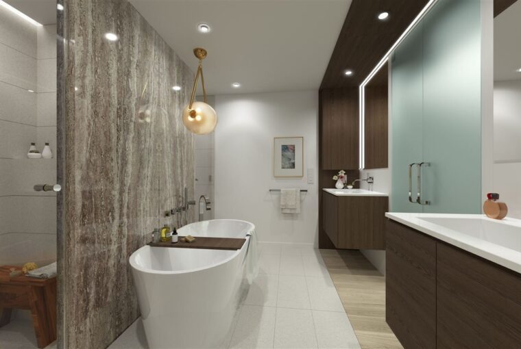 • Ensuite features a seamless free-standing soaker tub equipped with thermostat-controlled faucet and wand* and/or frameless glass and limestone shower with rain shower head and wall mounted wand