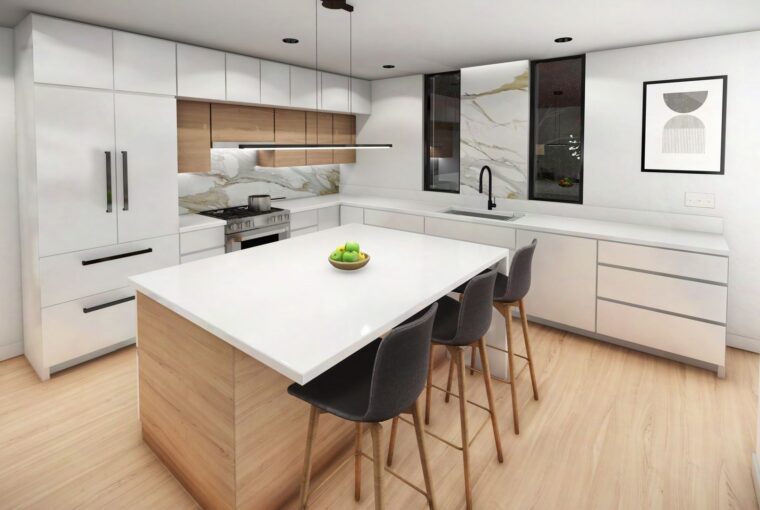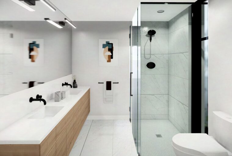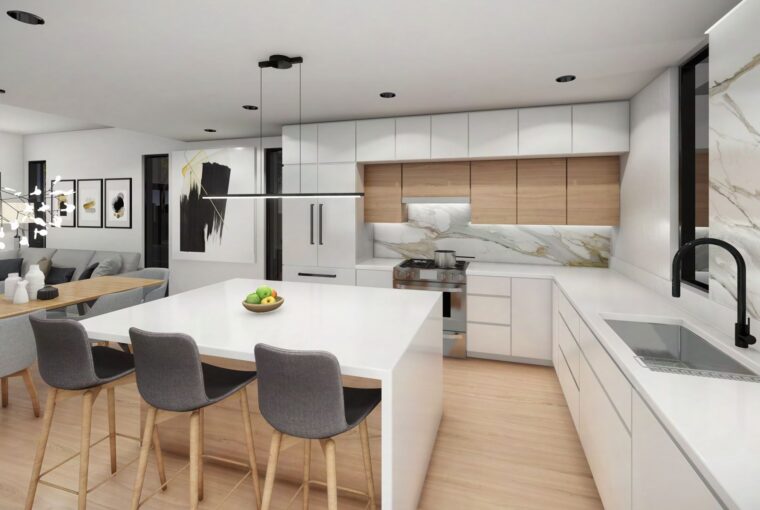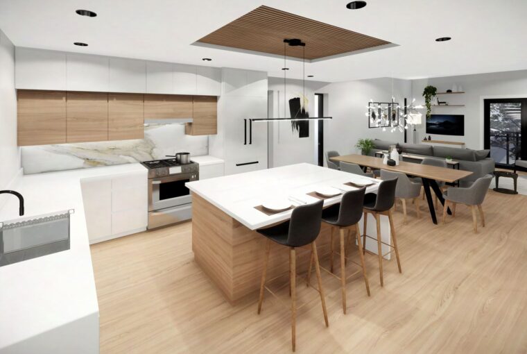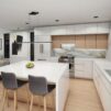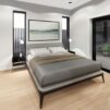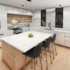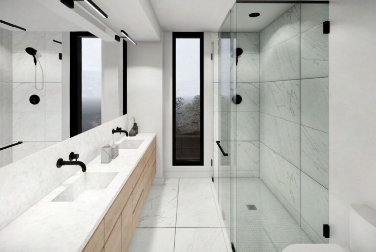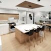 Engineered white oak hardwood floors perfectly balances the matte black hardware showcased throughout the kitchen and baths.