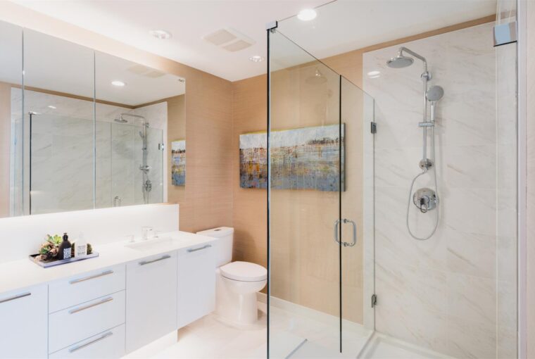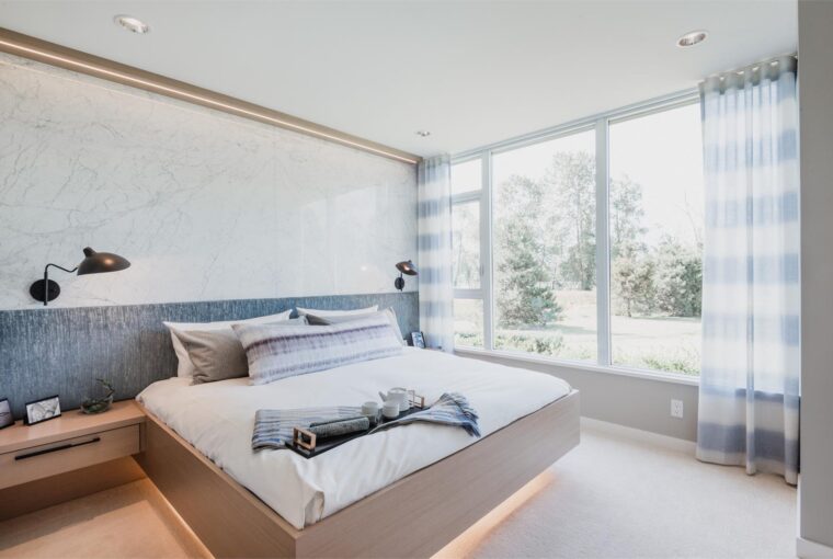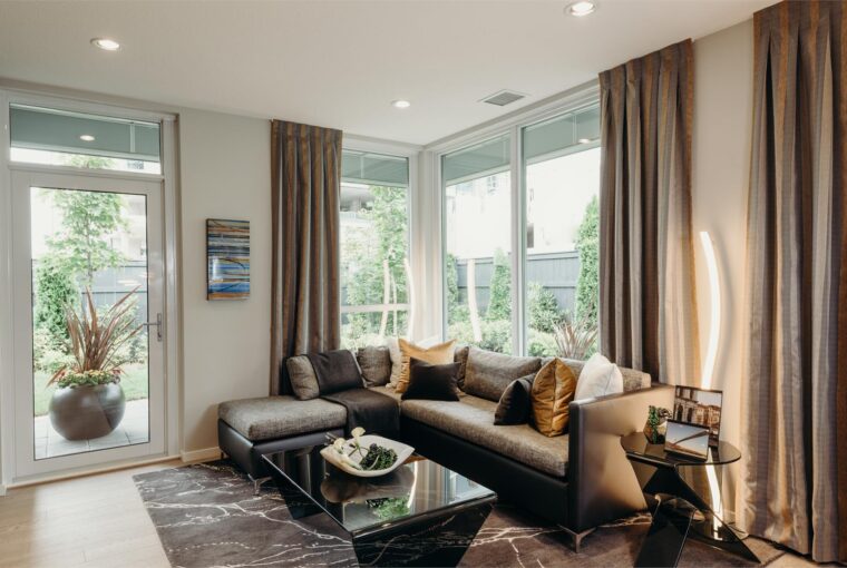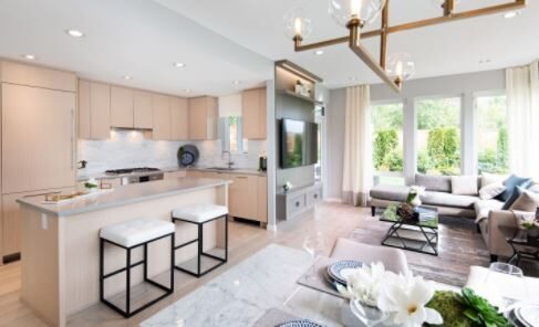 • Gourmet kitchens boast a pullout pantry, a kitchen island with a waterfall edge, an upgraded appliance package with a 36″ integrated stainless steel fridge with French doors and a wine fridge
