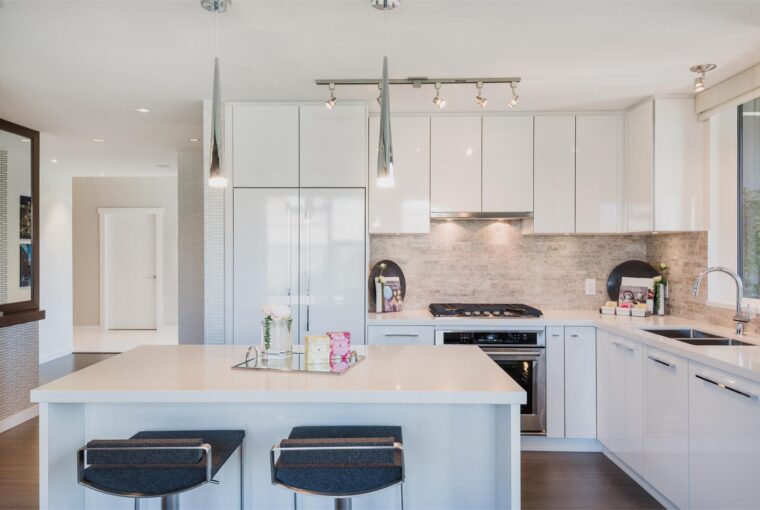• Overheight custom cabinetry is complemented by engineered stone countertops, sleek polished chrome pulls and under-cabinet lighting