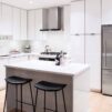 • Low maintenance quartz-composite countertops with contemporary tile backsplash