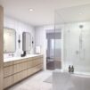 Custom individual vanity mirrors accented by modern sconces
