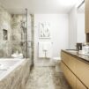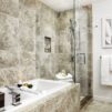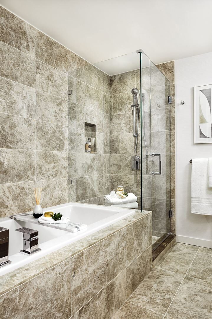 • Matching 12″ x 24″ premium marble tile surrounds the bathtub and shower walls for complementary spa-like serenity in master ensuite or primary bathroom • Inviting deep soaker tubs appointed with corresponding marble tile apron