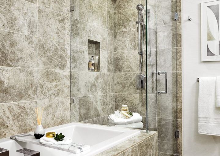 • Refined bathrooms feature 12″ x 24″ premium marble tile flooring